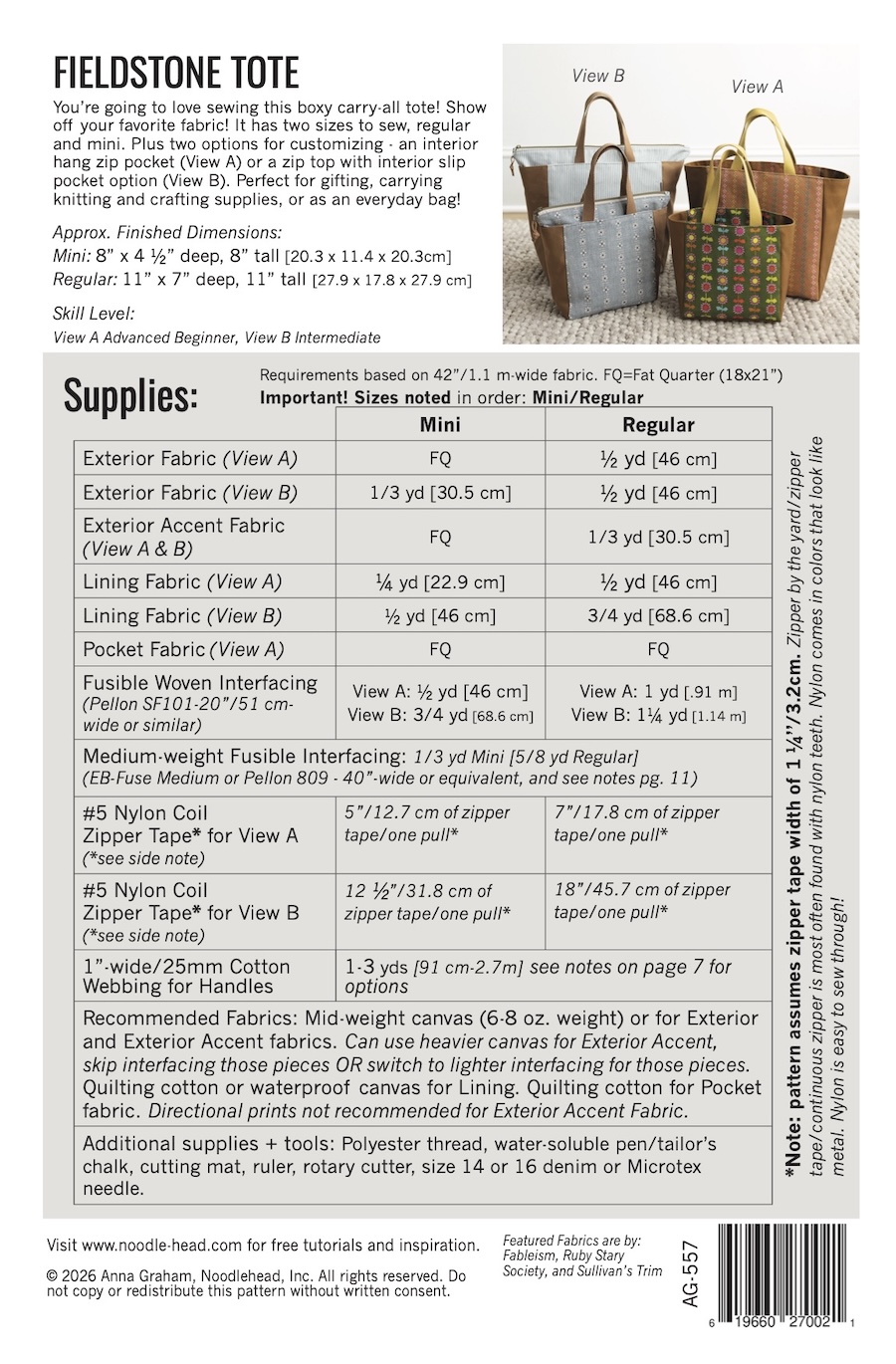 Two construction options: View A with interior zip pocket or View B with zip top and slip pocket